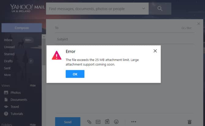 If you are using an Exchange Server account, the 20-MB attachment limit for Internet email accounts is not used by Outlook. Instead, Outlook uses the limit that is configured on your Exchange server. To modify the setting that is used to control the size of a message that is sent through an Exchange Server account, follow these steps. Yahoo Mail allows for unlimited storage in your inbox and other folders, and gives you the ability to share file attachments up to 25 megabytes in size. Note that this size limit includes the actual message in addition to the attachment, so you won’t be able to send an attachment that is exactly 25 megabytes. Email infrastructure is not designed to cope with large files. That’s why most email providers impose limits on the maximum size of a single attachment. However, if you really wanted to send presentations, photos, or other documents that exceed the Gmail attachment size, you have to two options: Break it into bits and send them bit by bit.